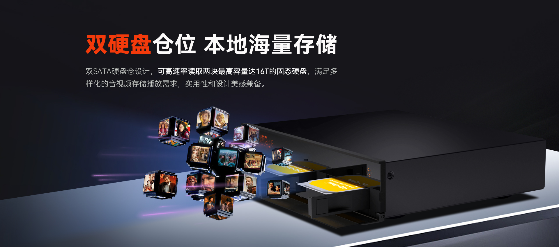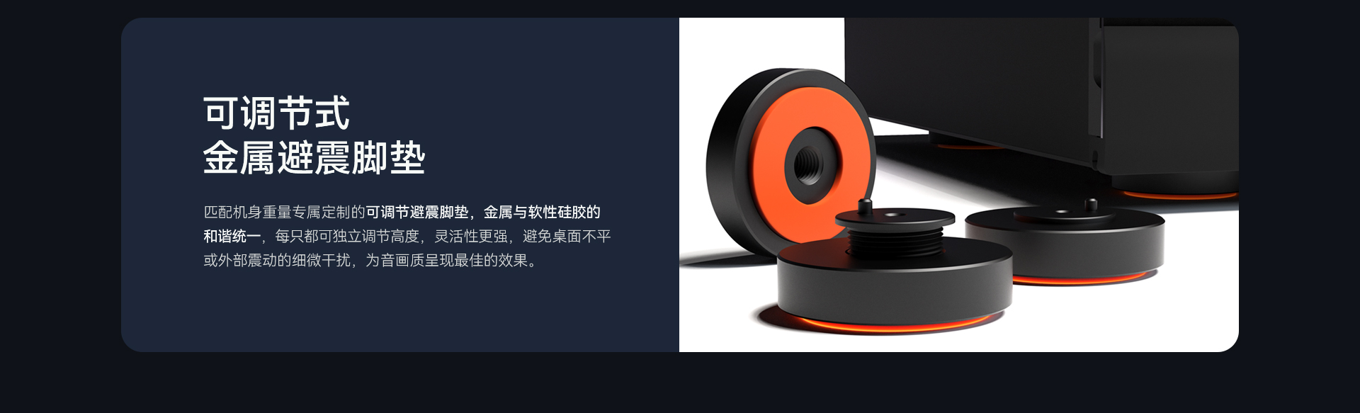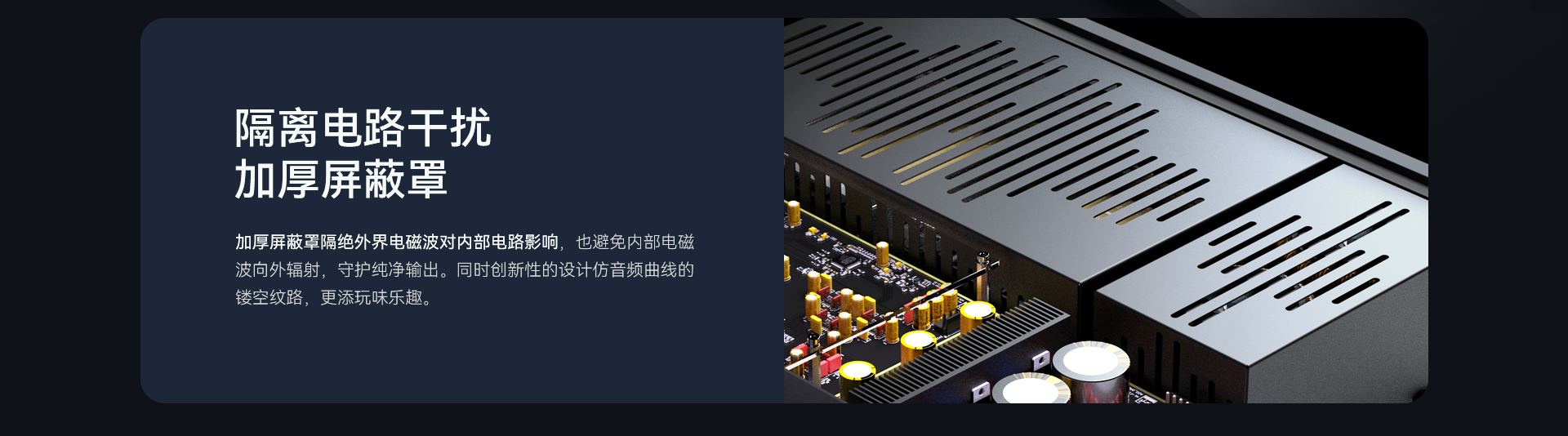 √ 整机专业级Hi-Fi设计理念,采用德国技术的定制化弹簧和铝基板对硬盘进行物理减震,使用滴水不漏的电磁屏蔽罩对干扰源进行隔离处理,对变压器和风扇进行硅胶减震,尽可能减少机器内部的干扰,为音画质呈现最佳的效果;