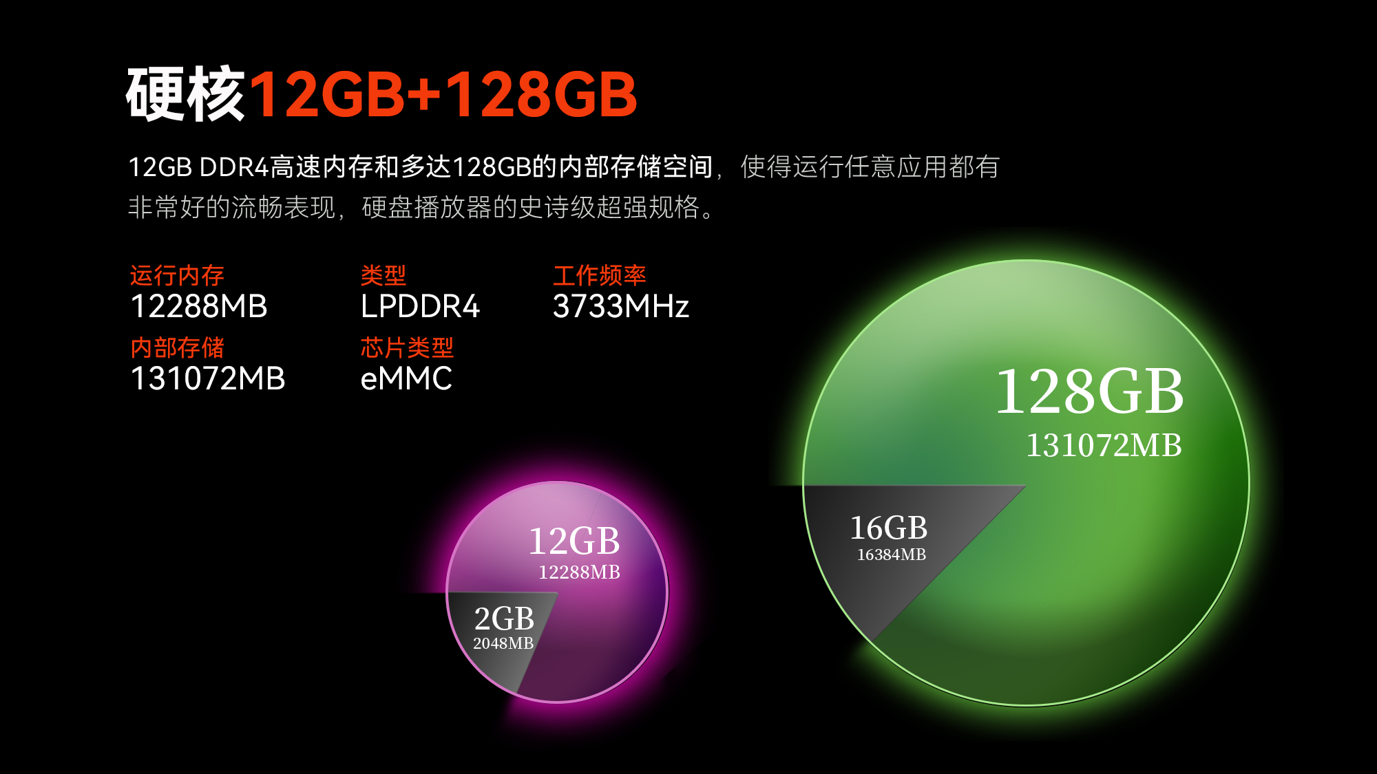 √ 八核ARM-A73极高性能CPU及多核G52 GPU ,12GB DDR4运行内存+128GB内部存储空间,带来超乎想象的整机性能和视频表现;